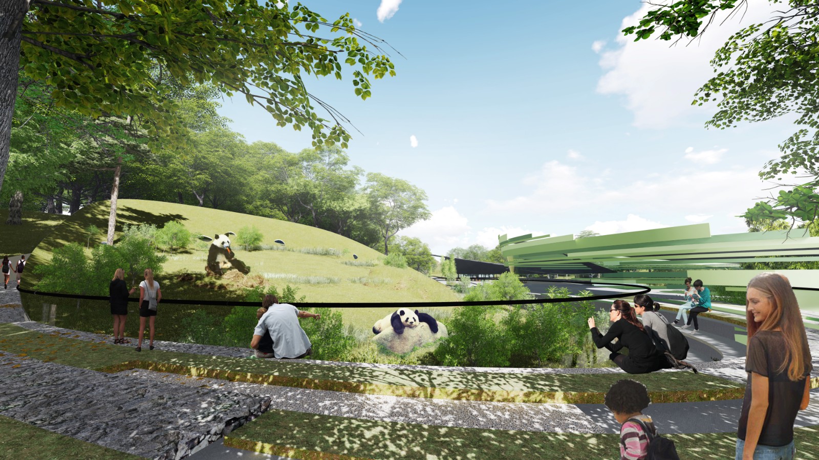建筑依山就勢,形成一個自然環(huán)繞的流線,步移景易,把動物和自然融為一體,創(chuàng)造更豐富的觀賞體驗。建筑消隱于景觀之中,只是界定路徑,以及界定游人觀看的方式。建筑激發(fā)游客和自然環(huán)境的互動,以及游客與熊貓的互動。游客與自然環(huán)境的互動,主要是指模糊人造環(huán)境和自然環(huán)境的界限,讓游客在不自覺中進入到更自然的環(huán)境里,恍惚間不知身在何處。