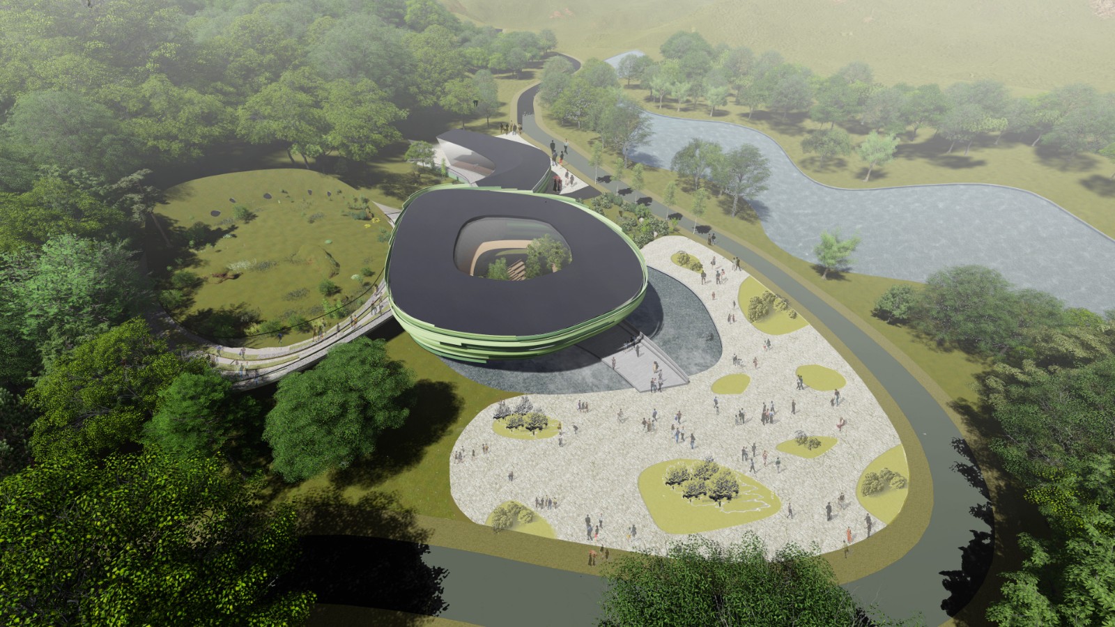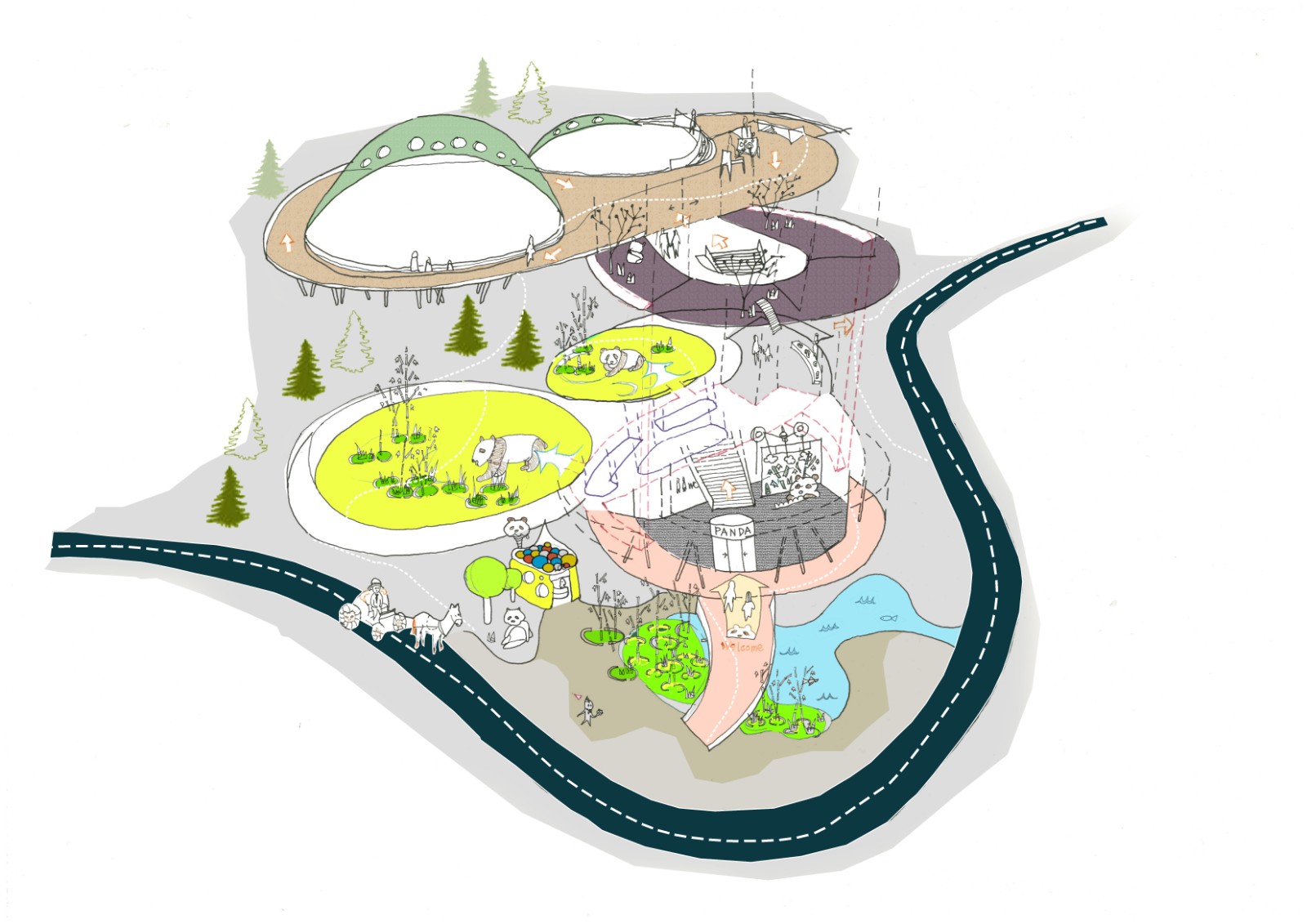 熊貓館的選址,呼應(yīng)從入口組團到現(xiàn)狀狼區(qū)的景觀體系,成為水系的對景。熊貓館的建設(shè),可以界定出一個新的園區(qū),以步行為主,電瓶車為輔,解決了舊園區(qū)流線過長,而導(dǎo)致的觀賞方式過于單一的問題。此外,該區(qū)域地形平緩,景觀資源豐富,未來可以植入更多的場館,打造新的園區(qū)形象。