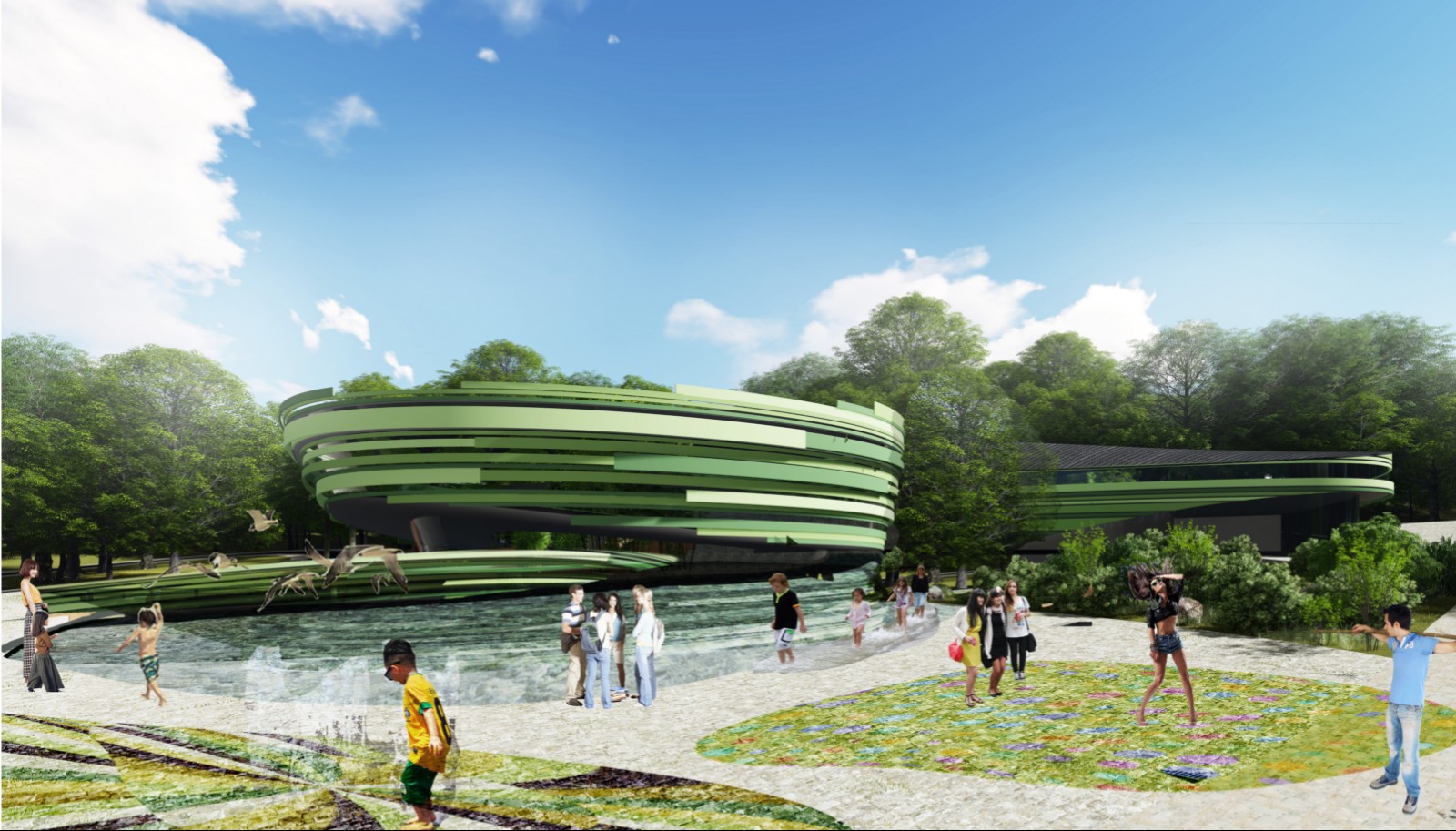 游客與動物之間的互動,主要是指革新原有動物園單一觀賞動物的方式,整個觀賞線路濃縮了遠眺,俯瞰,平視,仰視,甚至偷窺等多種觀看模式。此外,游客和動物之間的互動,也包括更多的可參與的游樂方式,包括虛擬的互動,多媒體,豐富的周邊產(chǎn)品的開發(fā),以及餐廳等服務(wù)設(shè)施與熊貓場館之間的互動。游客可以一邊休息,享受熊貓主題的美食,一邊看窗外的熊貓,享受它的大餐。流線的設(shè)計,充分體現(xiàn)了“浸入式”的觀賞理念。人不是觀看籠子里的困獸,而是先進入到動物的自然狀態(tài)的環(huán)境里,再來觀看動物。